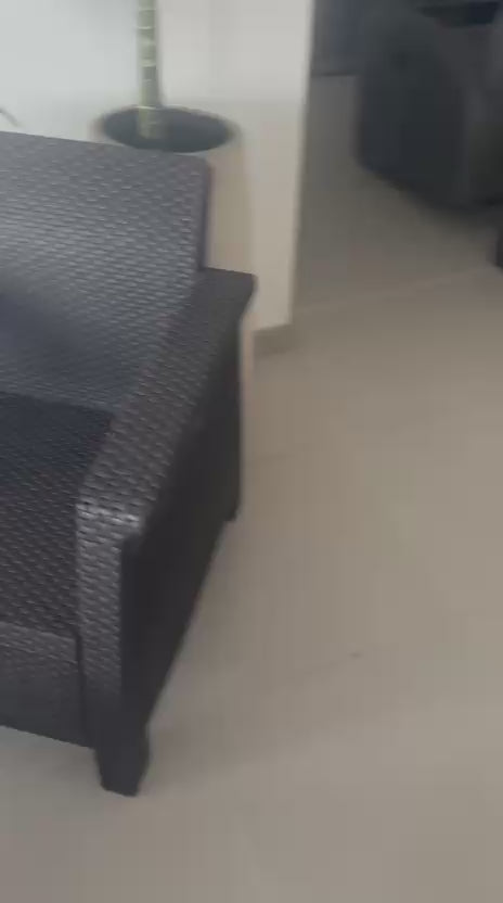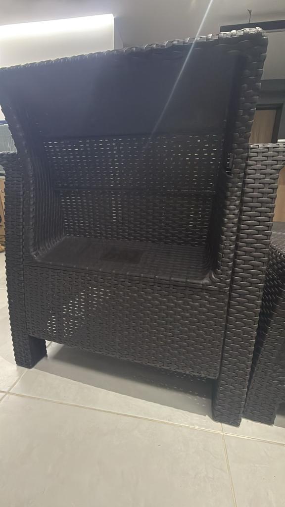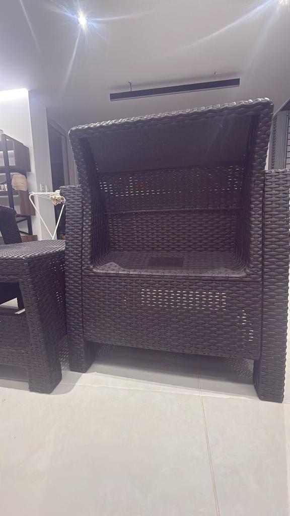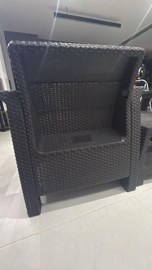 Descripción: dos sillas y una mesa de exterior de ratánEstado: 9/10 (en la parte de atrás se le cayó una tapa, desgaste normal por uso)Marca: Home CentryMaterial y color: Café oscuroUbicación: Medellín (Envigado), Colombia
